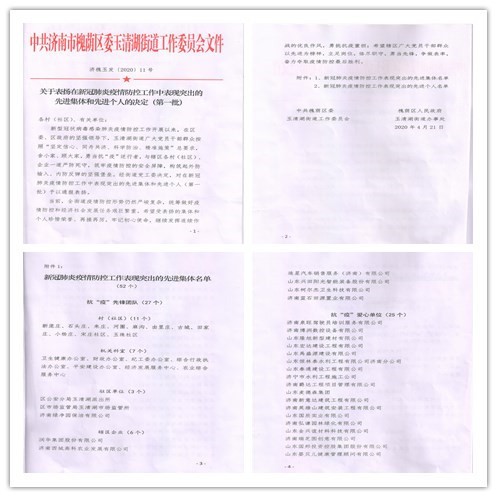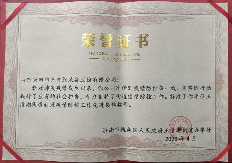 我公司——山東興田陽光智能裝備股份有限公司,因在新冠肺炎疫情防控工作中表現(xiàn)突出,被槐蔭區(qū)玉清湖街道評為“新冠肺炎疫情防控工作表現(xiàn)突出的先進(jìn)集體”,并被授予“抗‘疫’先鋒團(tuán)隊”榮譽(yù)稱號。