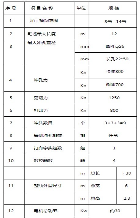 槽鋼三面沖主要用于送變電與通訊行業金具生產以及建筑行業的槽鋼構件的打印、沖孔和切斷工藝。槽鋼三面沖具有獨立的液壓動力機構和電氣數控系統,采用中央集中控制。同時為了方便主機的模具調整和其它部件調整,也具有部分分散控制動作。下面重點介紹一下槽鋼三面沖主要技術規格。